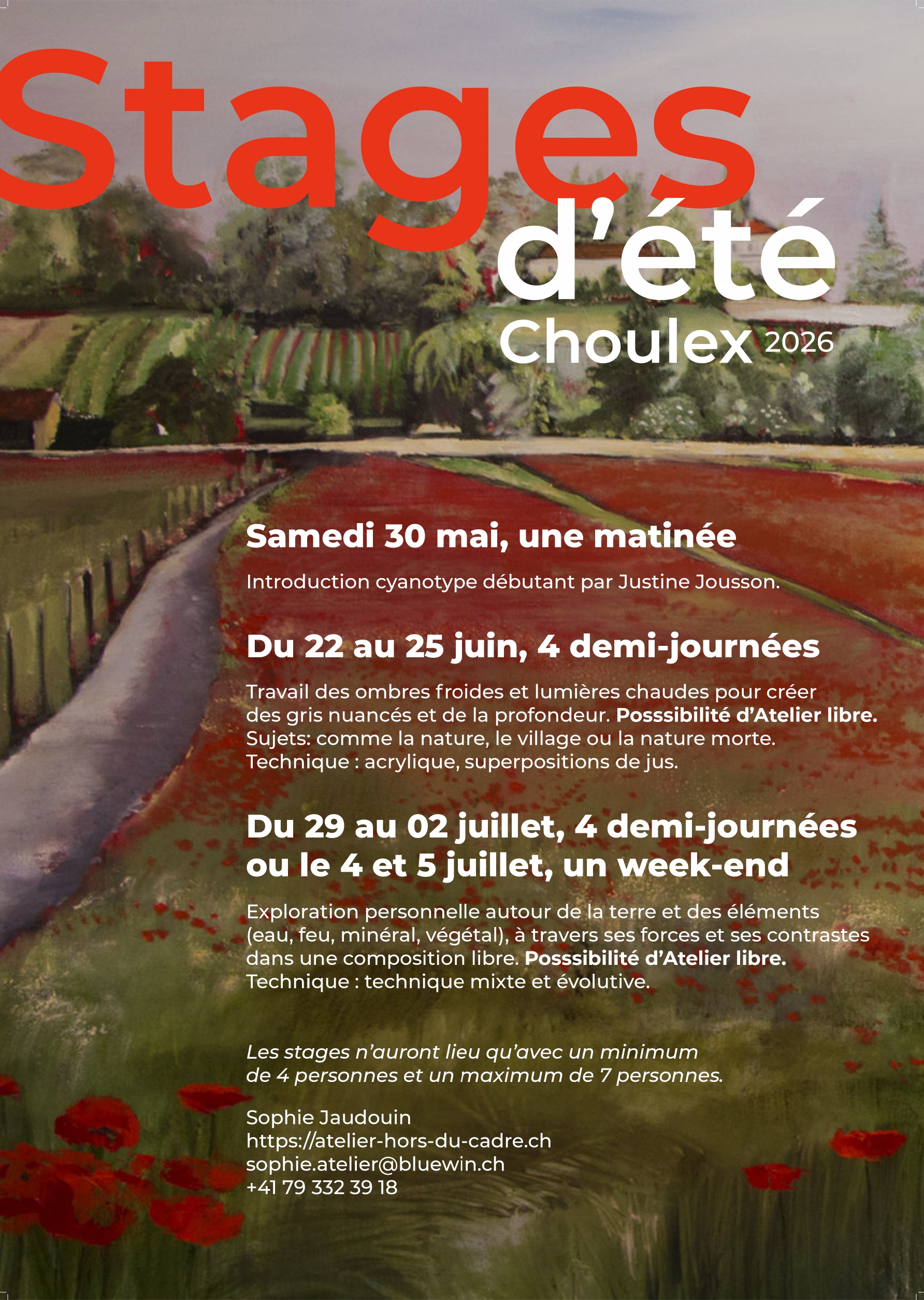 « Voici une quinzaine d’année, portée par l’envie de partager mes expériences dans des cours de peinture à Genève, j’ai ouvert l’Atelier hors du cadre à Choulex. Le plaisir d’échanger et de voir l’épanouissement que cela suscite auprès de mes élèves me confirme que je suis sur le bon chemin. »