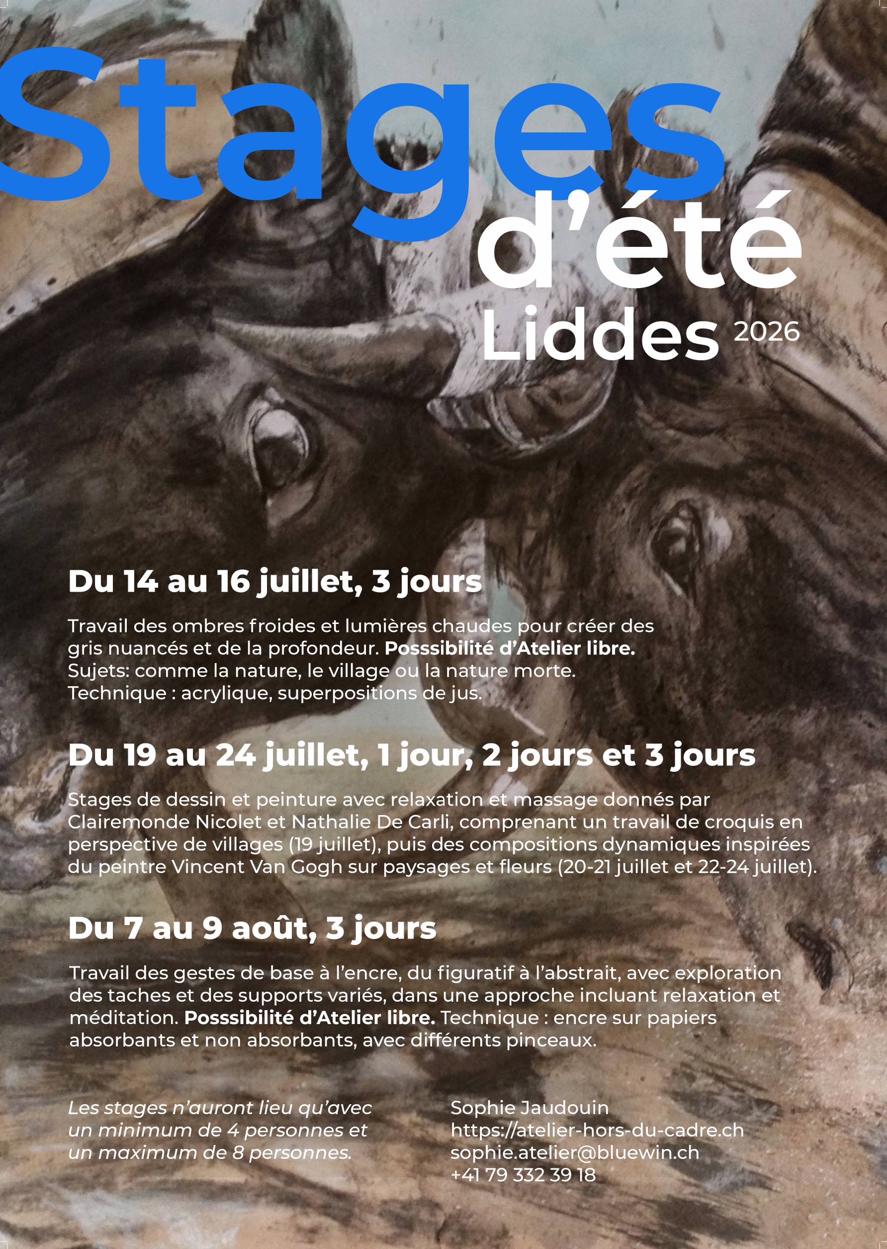 L’Atelier Hors du Cadre à Choulex, dirigé par Sophie Jaudouin est un lieu où l’on peut apprendre à maîtriser toutes sortes de techniques artistiques et d’exercer son oeil et son geste à travers la peinture et le dessin pour ensuite développer son propre sens artistique.